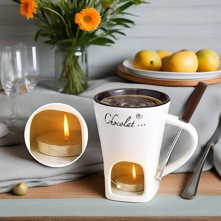 Simply place a small candle underneath the mug, and within minutes, the heat will melt your chocolate into a smooth, velvety fondue. No complicated machines or electrical outlets are needed—just light the candle and enjoy!